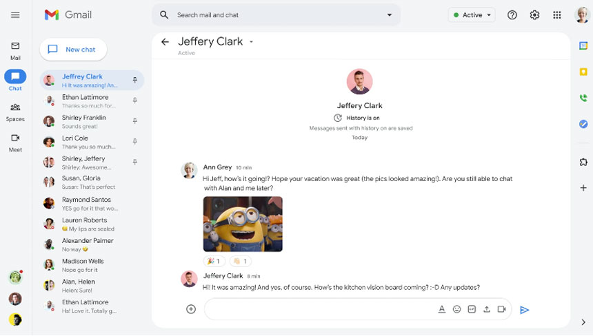Google afirma que Chat es una mejor manera para que los usuarios se conecten con otros. Según la empresa, la nueva vista integrada en Gmail facilita el uso de Chat junto con la bandeja de entrada de Gmail, Spaces y Meet.