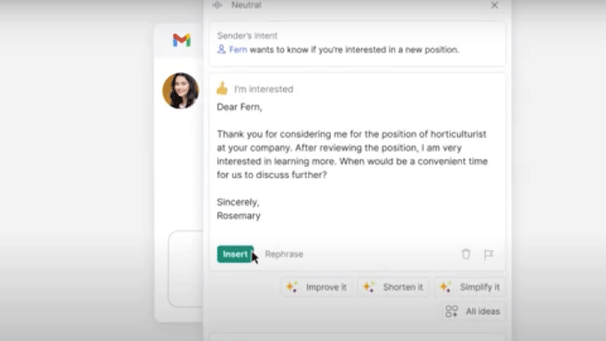 Al igual que ChatGPT, GrammarlyGO es capaz de crear texto basado en un aviso breve y señala avisos con un solo clic como “No estoy interesado”.