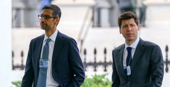 Ayer, el vicepresidente Harris y altos funcionarios de la administración se reunieron con los directores ejecutivos de Alphabet, Anthropic, Microsoft y OpenAI para alentarlos a aplicar salvaguardas que mitiguen los riesgos y los daños potenciales para las personas y la sociedad [En la imagen, Sundar Pichai, director ejecutivo de Google, a la izquierda, y Sam Altman, director ejecutivo de OpenAI, llegando a la Casa Blanca.]