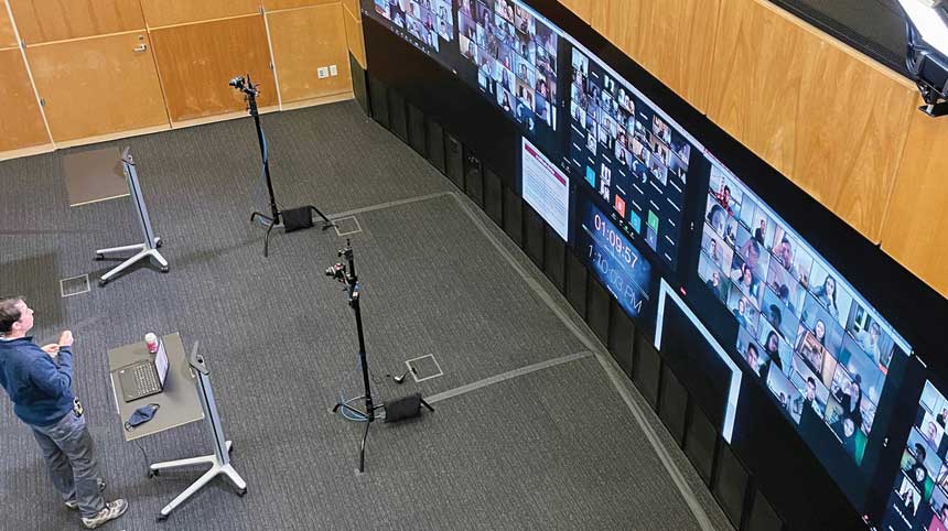 La Universidad de Stanford instaló un muro de video de 32 por 8 pies con 250 estudiantes a la vez en Zoom, como se muestra en la imagen a continuación.