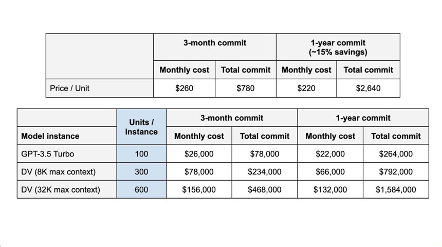 El servicio será costoso. Ejecutar una versión liviana de GPT-3.5 costará $ 78,000 por un compromiso de tres meses o $ 264,000 durante un compromiso de un año.