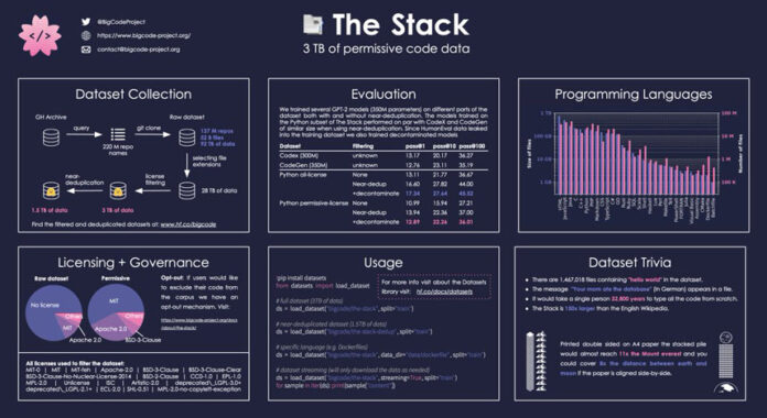A diferencia de Copilot, el StarCoder de 15 mil millones de parámetros se entrenó en el transcurso de varios días en un conjunto de datos de código abierto llamado The Stack, que tiene más de 19 millones de repositorios seleccionados con licencia permisiva y más de seis terabytes. de código en más de 350 lenguajes de programación.