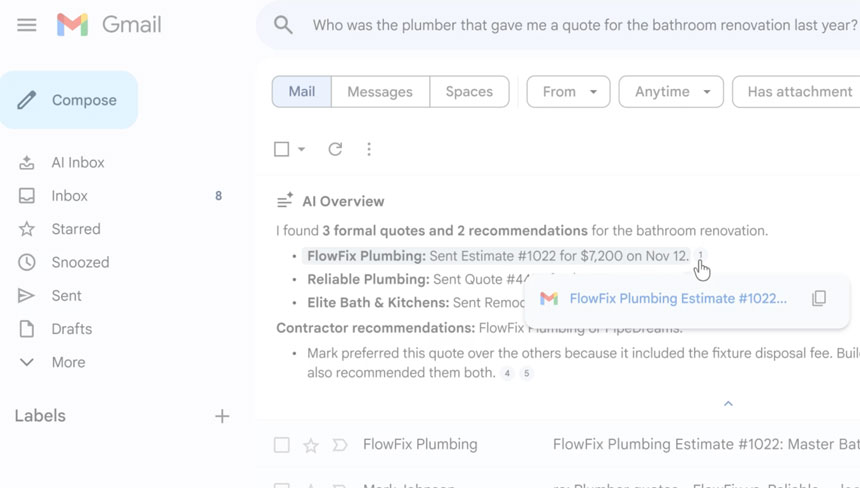 Google anunció una nueva vista de bandeja de entrada para Gmail impulsada por Gemini 3, llamada “Resúmenes de IA”. Utilizará IA para presentar resúmenes, temas, informes y tareas pendientes.