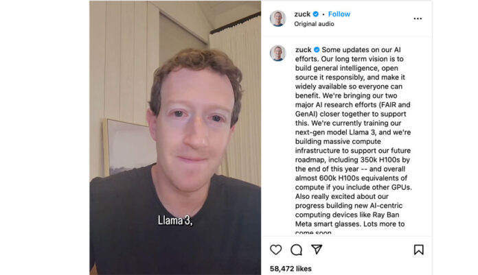 También señaló que la empresa está actualmente entrenando Llama 3 y anunció que su empresa está construyendo una “infraestructura informática masiva” que incluye 350.000 Nvidia H100 para finales de este año. .
